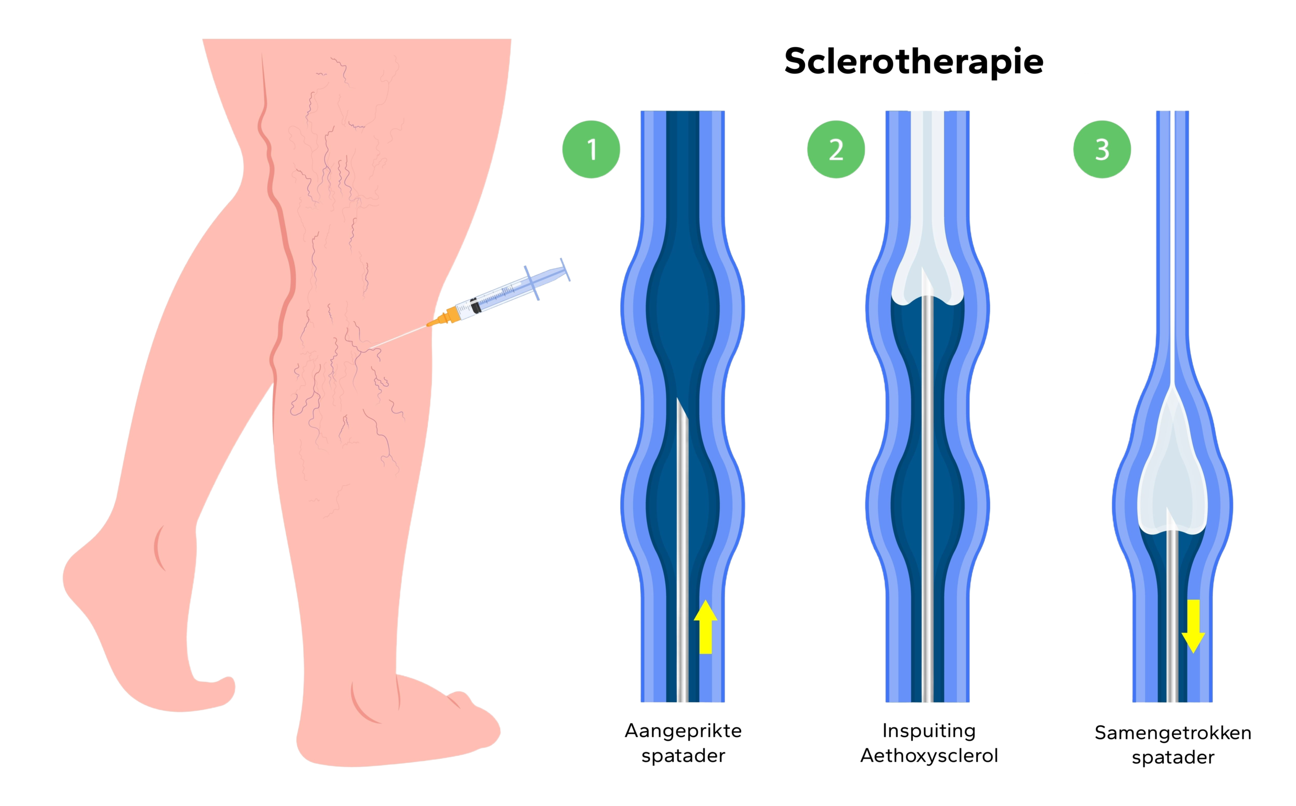 Indien de aders wat groter zijn kan van hetzelfde product een schuim (“foam”) worden gemaakt. Dit schuim wordt onder geleide van echografie ingespoten. Dit is de zogenaamde “foamsclerotherapie”.