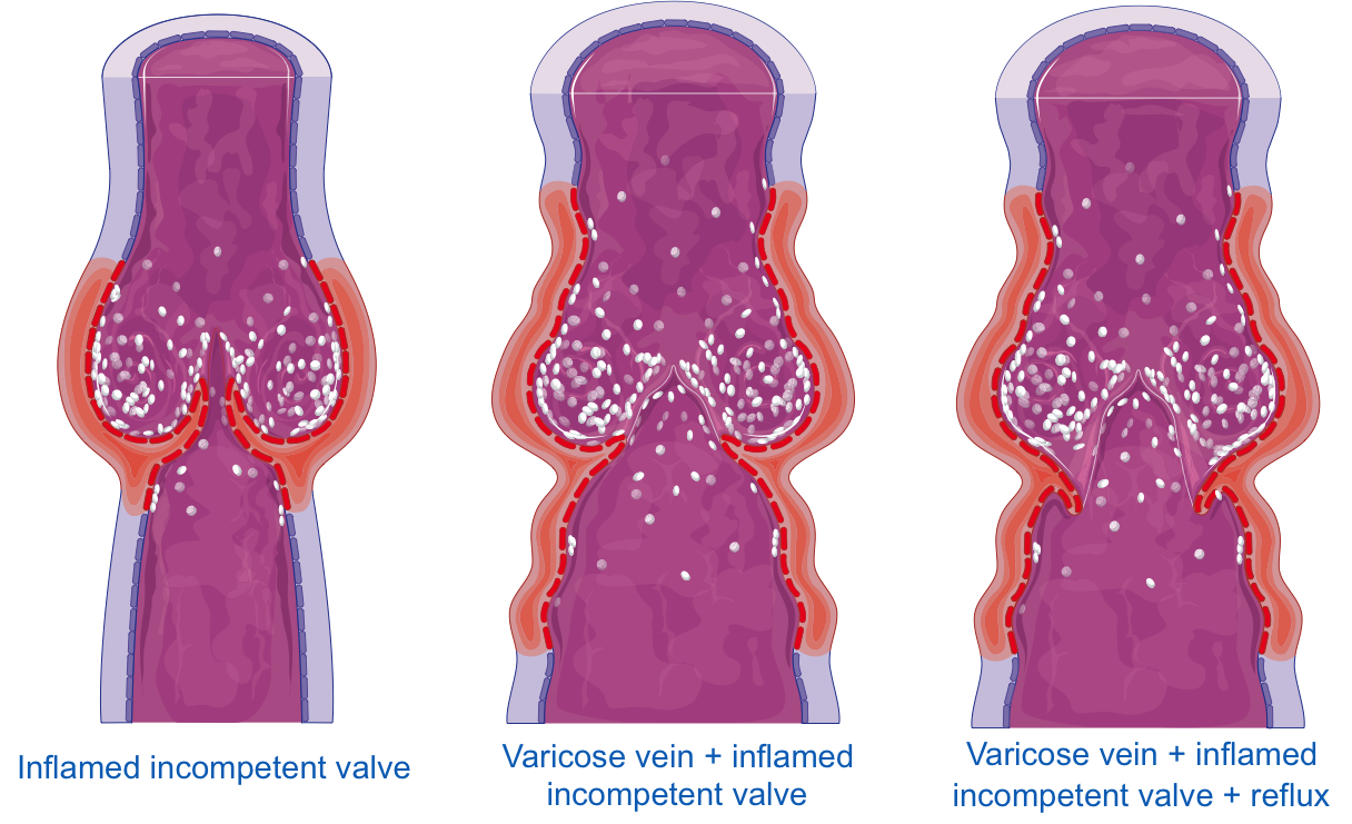 Wanneer deze klepjes niet meer goed afsluiten, zal het bloed de verkeerde richting uit beginnen te stromen, met de zwaartekracht naar beneden toe. Situeren de lekkende kleppen zich in de oppervlakkige aders, dan spreken we van oppervlakkige veneuze insufficiëntie. Dit manifesteert zich door zichtbare kleinere of grotere uitgezette aders of dus spataders. Doet het probleem zich in de diepe aders voor, dan spreken we van diepe veneuze insufficiëntie, die zich vaak vooral kenmerkt door zwelling van de benen en pas in een latere instantie aan de oppervlakte zichtbaar wordt.